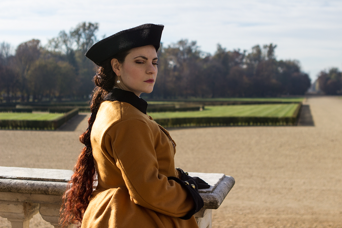 I wanted it in velvet but I thought it would have been too pretentious to be a first riding costume so I went for wool. I didn't have a particoular colour in mind and I chose a pumpink wool I found at a very good price in my home town. I also bought black wool for waistcoat, collar and cuffs. I wanted to look the most accurate as possible so I wore the proper undergarments (chemise, stays, pocket hoops, petticoat and riding shirt) including the riding waistcoat; now the fun part: tailoring. Seriously, tailoring is totally different from regular dressmaking. For my waistcoat I used my Outlander jacket as reference for the main body, enlarging the front pieces and elongating a lot the skirts as seen in "Patterns of Fashion" and "The cut of women's clothes"; the back has lacing as the male waistcoats. It is lined in cotton and it came together really quicly (sadly I didn't take photos of it during the event!) with hand finishing on the outside but machine sewn buttonholes. It was really warm!